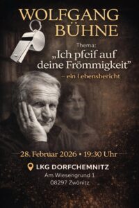 ![]() | 28.02.2026 19.30 Uhr | Herzliche Einladung zu einem Abend mit Wolfgang Bühne Thema: "Ich pfeif auf deine Frömmigkeit" Ein Lebensbericht in der LKG Dorfchemnitz |