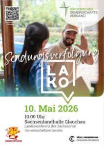 Landeskonferenz in Glauchau 26. Februar 2026 von Termin Details Datum: 10. Mai 2026 10:00 – 17:00 Ort: Sachsenlandhalle Glauchau Terminkategorien: Gemeinschaft Flyer zur Veranstaltung