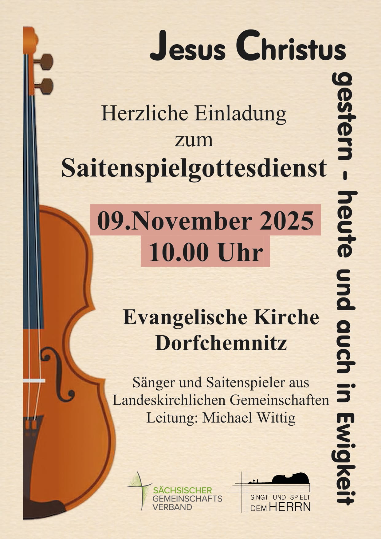 Saitenspielgottesdienst mit Michael Wittig 19. März 2025 von Termin Details Datum: 9. November 2025 10:00 – 11:00 Ort: Kirche Dorfchemnitz Terminkategorien: Gemeinschaft Saitenspielgottesdienst mit Michael Wittig